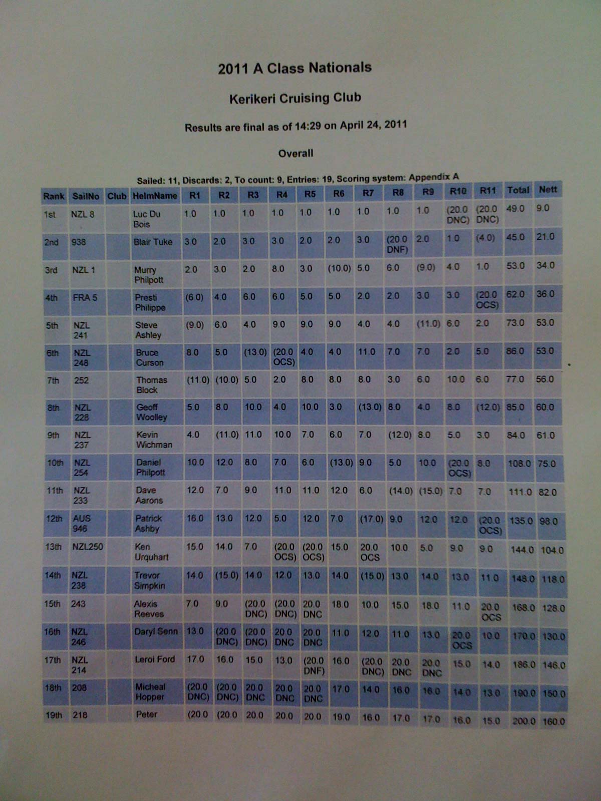 Le championnat se déroulait à KeriKeri sur la cote Est de l'île Nord. Avec 19 bateaux en course, ce fut le championnat avec la plus grande participation de ces dernières années. Nous avons fait un total de 11 manches sur trois jours dans des conditions variant entre 10 et 16 knts. J'ai navigué avec le DNA de Dean Barker ce qui m'a permis de m'entrainer au trapèze au portant.