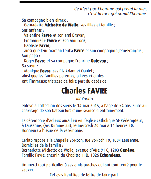 je suis au regret de vous informer du tragique décès de notre membre Charles "Carlito" Favre. Le tragique événement est survenu le jeudi 14 mai 2015, sur le lac Léman. Les secours arrivés sur place on tenté de réanimer Charles durant 45 minutes sans succès.