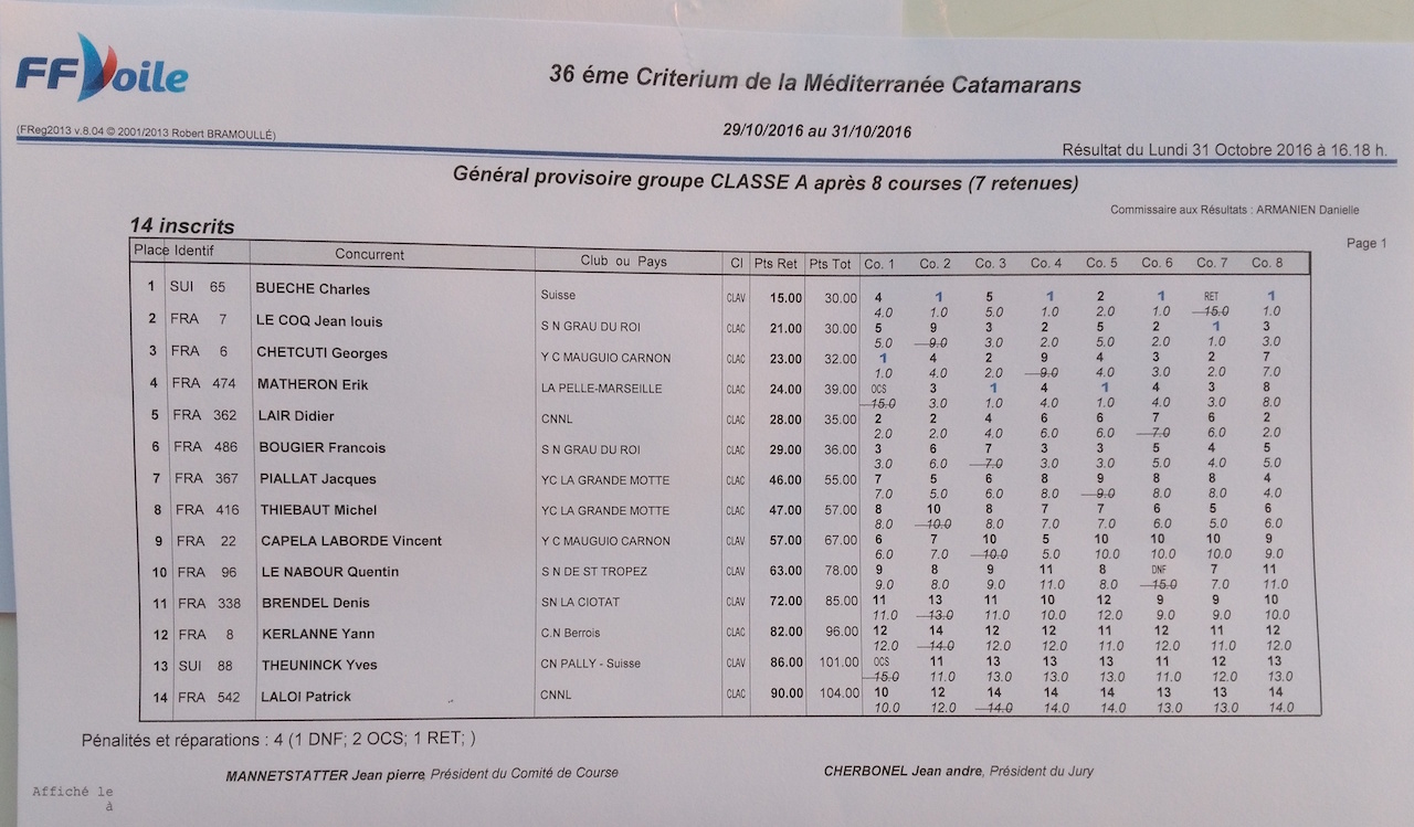 Le 36ème Critérium de la Méditerranée a eu lieu du 29 au 31 octobre 2016. Seuls 14 A-Cats ont trouvé le chemin de La Pelle, probablement en raison du manque de vent annoncé, mais aussi de la situation "politique" en France, ou les flottants et volants ont cessé de se parler sereinement. Il y a du travail de conciliation à faire de ce côté-là. Dommage, à la fin on s'amuse bien avec nos beaux jouets, et ces histoires ne font que ternir l'image de notre classe qui par ailleurs se porte très bien.