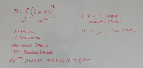 As usual, multiple boat-park discussions occurred during the week, one of it was the wind limits. Some US sailors wanted to reduce it, but after showing them the second part of rule 10.3 "The Race Committee should also take into account the wave conditions to ensure safe sailing conditions", the discussion ended nowhere, except for the formula below that was drafted after too many beers by the pool.